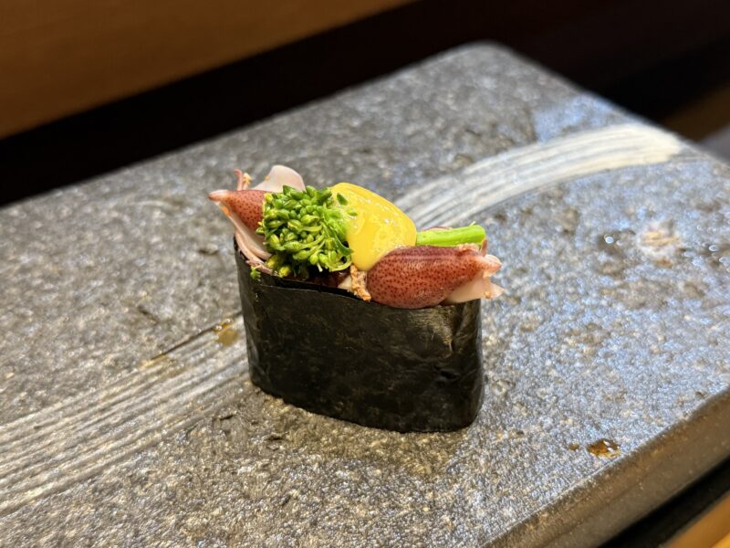 春を告げる富山の風物詩、ホタルイカ。菜の花のほろ苦さとからし味噌の風味が重なり、「ああ、富山の春だな」と思わず目を細めたくなる一貫です。