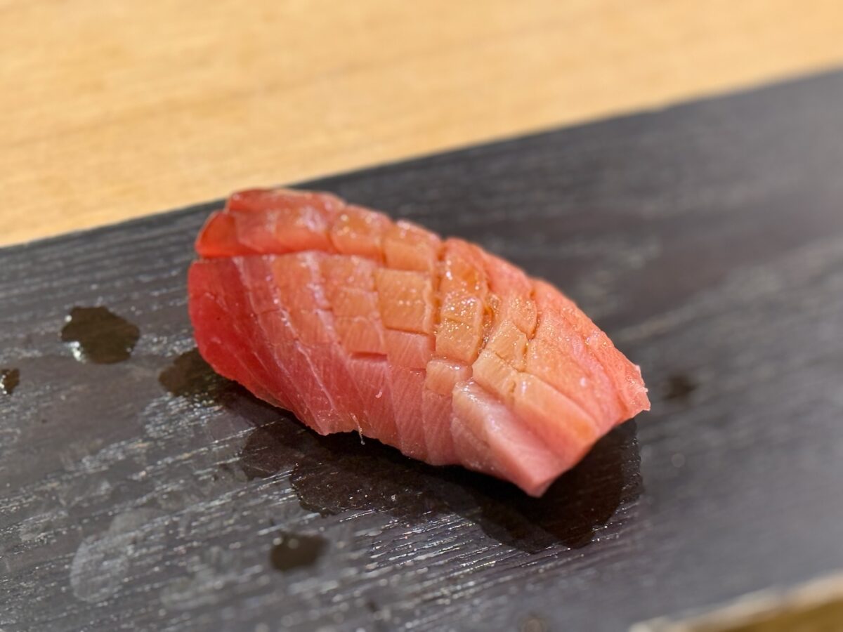 赤身の鮮やかな色とサシのグラデーションが、見ているだけで食欲をそそります。包丁で格子状の切れ込みが入れられており、シャリとの絡まり方が計算されています。口に入れた瞬間の脂の溶け方が、丁寧な仕事を物語っていました。